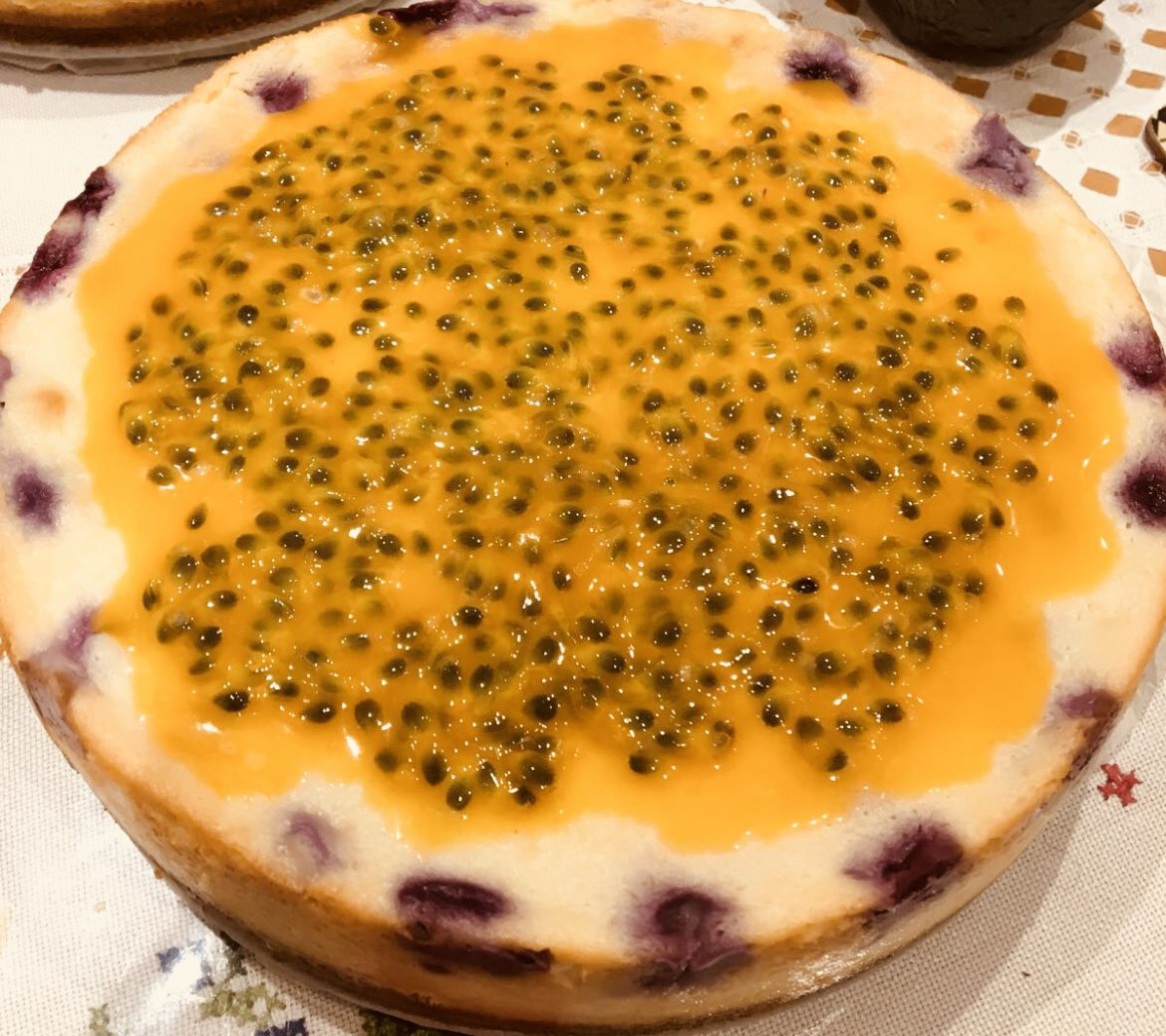 Blueberry and Passionfruit Baked Cheesecake! All my favourite ingredients in one desert! My cousin Kieran made this over Christmas, the month where calorie counting does not matter!! I made it on Friday and its Saturday afternoon and its all gone!