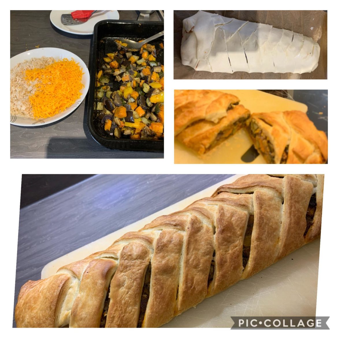 2. Mix the cooled roast veg, breadcrumbs and cheese and spoon in the middle of the pastry - check which way gives you the longest plait , vertically or horizontally and then add the mixture along the middle like a saugsage.